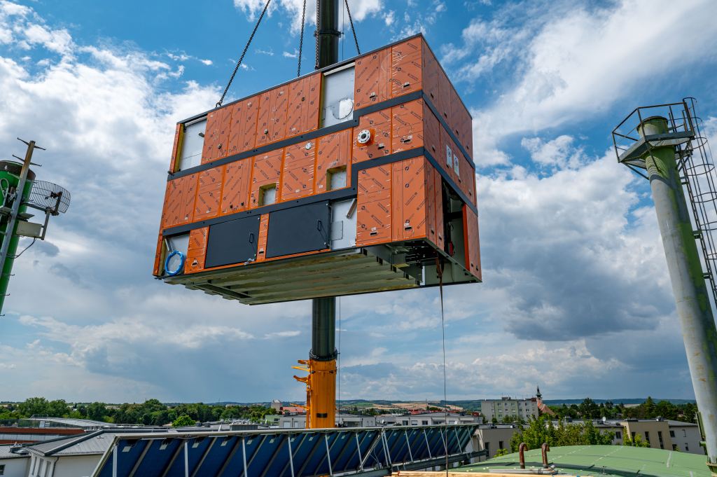 Der neue, tonnenschwere Biomassekessel schwebt über Wolkersdorf