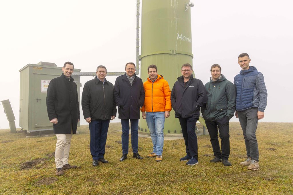 Foto (v.l.n.r.): Philip Forstner und Richard Kalcik von der ÖKOENERGIE, Matthias Stadler, Bürgermeister von St. Pölten, Manuel Aichberger, Bürgermeister von Lilienfeld, Franz Gruber und David Obergruber von der EnergieRegion St. Pölten sowie Christian Anzberger, Betreuer der EEG Lilienfeld, beim Windrad „Mona“ in Eschenau.